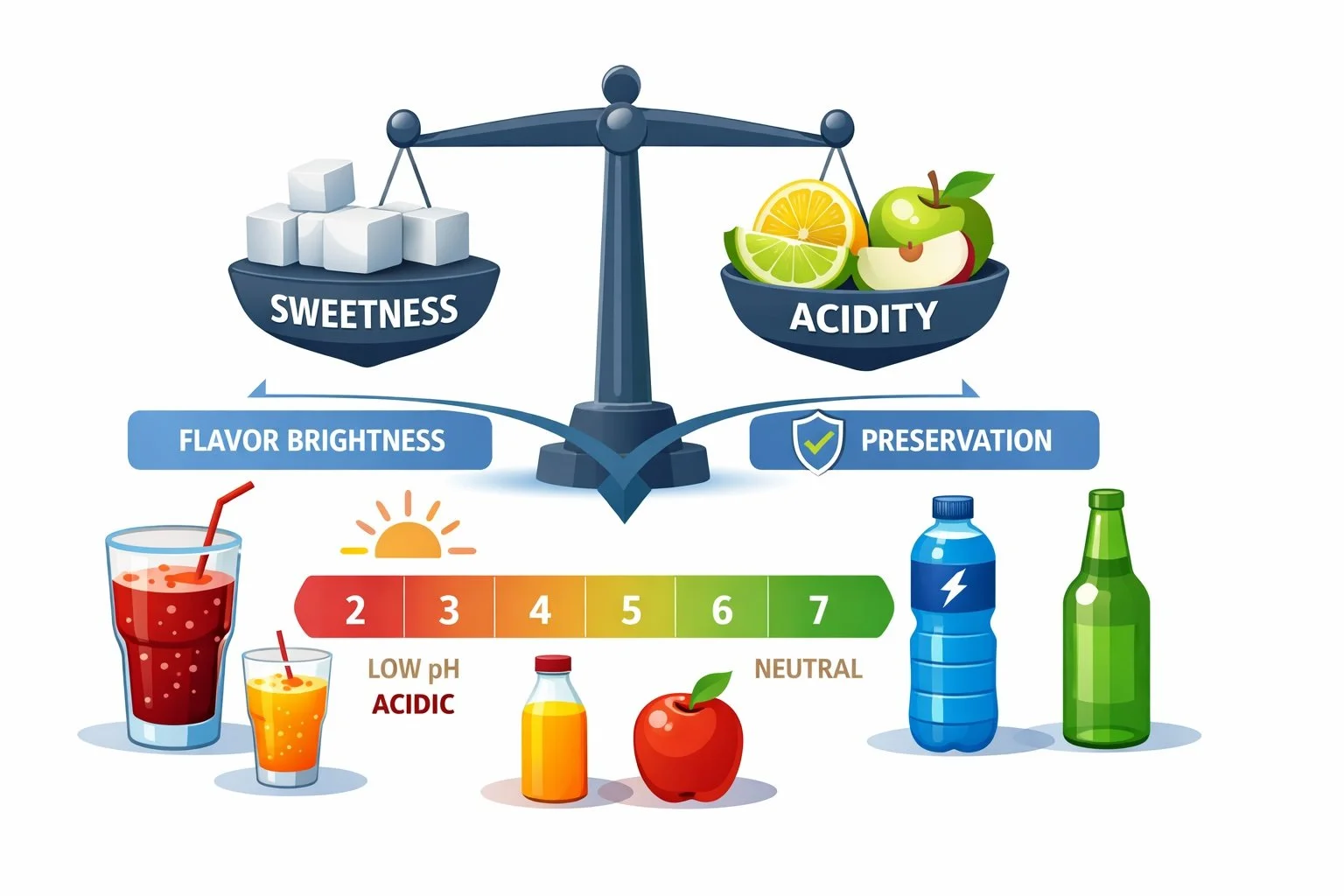 Preservatives like sodium benzoate and potassium sorbate are also more effective in lower pH environments, meaning acid systems often work together with preservation strategies.