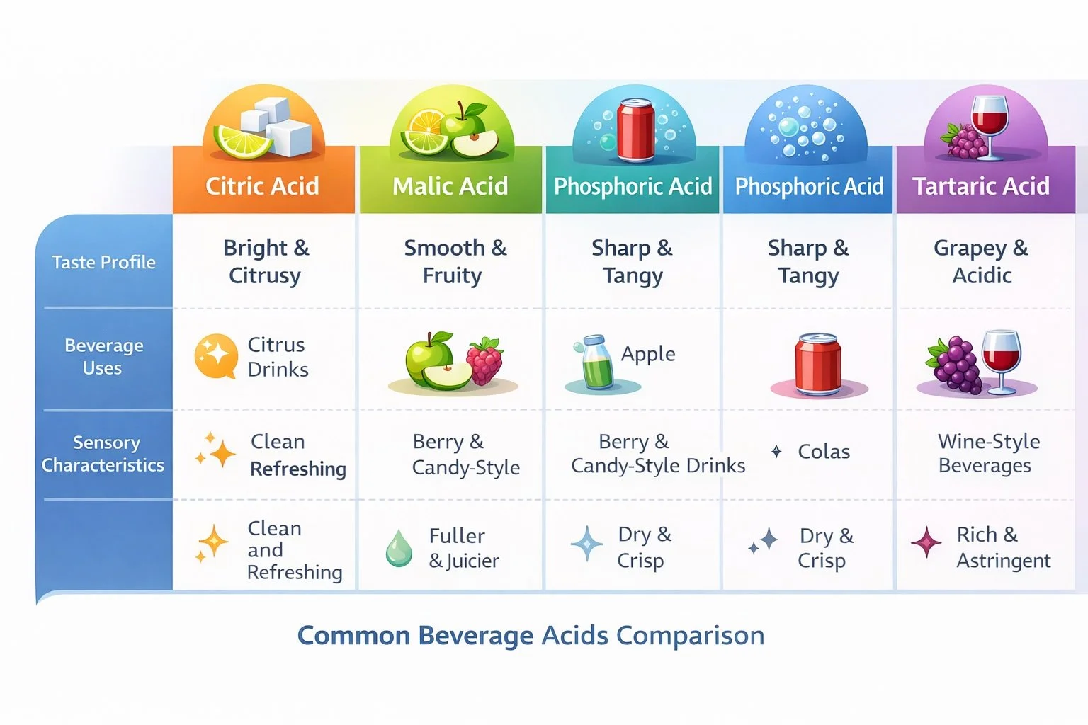 Beverage developers typically work with a small group of acids that each provide slightly different sensory characteristics.